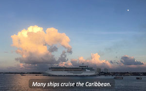 LaVerne and I opted not to go ashore but we had a wonderful view of the island from the ship and there were plenty of activities on board the ship to keep us busy during the day. However, in-door activities really aren't needed as the western Caribbean Sea is so beautiful and provides such a wonderful setting that a whole day is easily spent just relaxing in a deck chair and watching the white caps break over the clear, azure waters. Grand Cayman is the largest of the Cayman Islands and is home to blue iguanas, amazon parrots, turtles, and the Central American agouti which slightly resembles a large rat. There is a good variety of plant life on Grand Cayman due to its tropical location with wild banana orchids, ghost orchids, palm trees, and mahogany trees. They also have fruit trees such as breadfruit, tamarind, mango, and avocado. Passengers who went ashore were telling stories of avocados as large as grapefruit. That would be my dream - unlimited guacamole salad. We had a beautiful day weather wise in the Caymans and soon happy tourists were back on board and it was time to head to our next port - Aruba!