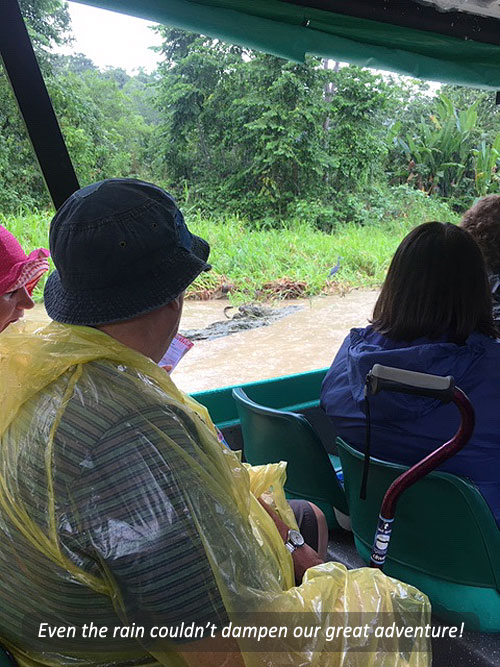 We soon arrived at the train that would carry us on an impressive tour of the rain forest. This was made even more impressive since the windows were fogged over and the accumulated raindrops made it difficult to see anything outside unless the windows were open. My window seat view of Costa Rica was impaired when raindrops kept falling in my face. It was a good ride though it was also nice to get back on the dry bus to go to our last stop - a boat tour. The dock area where we boarded the tour boat was rapidly filling up with water. We climbed aboard and found a couple of seats. The boat sat very low in the water and had a cover over the top but the sides were completely open. Once again, I sat in the window seat and rain began to soak the right side of my body. I tried to use my umbrella as a shield but it was useless. There are times in life where you just have to roll with whatever you're given. The heavy current of the water made the boat difficult to steer but the operator was able to get us to places where we could view sloths just chillin' out in the trees and monkeys hanging on the branches looking at us looking at them. (In the picture above, the brown figure in the middle is a sloth.) In spite of getting soaked, the boat tour was a lot of fun.